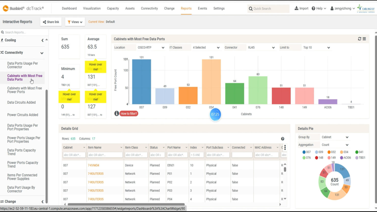 And DC Twin can generate reports to provide details on which connections and devices are in use and which rack elevations are available in a specific data center?